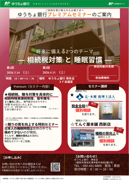 第一回 3/14㈯ ゆうちょ銀行プレミアムセミナーにて個別相談会を開催します!ただいま、ご参加...